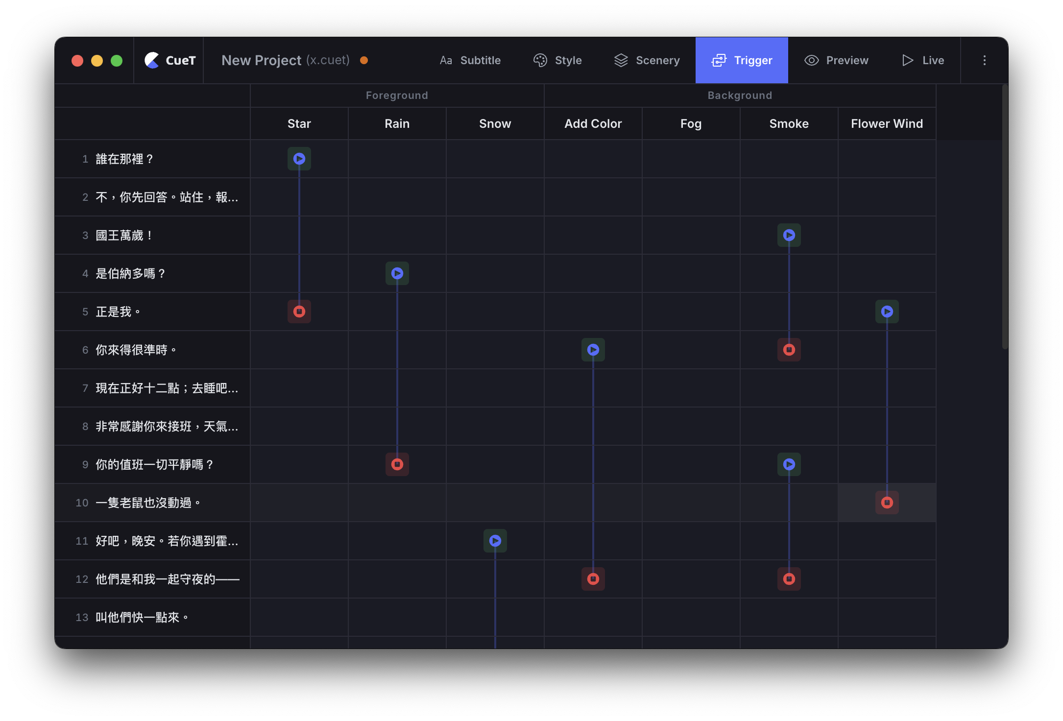 Automatic triggers for scenery effects linked to subtitles.